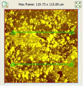 Сканирование полученных царапин проводилось в полуконтактном режиме тем же наконечником, которым проводилось царапание. На каждой из царапин были проведены поперечные сечения, по которым можно судить о качественном различии в твёрдости в разных областях поверхности. Для вертикальных царапин приведены вычисленные по измеренным ширинам значения твёрдости. Пример царапины с профилями сечений показан на рисунке 3.