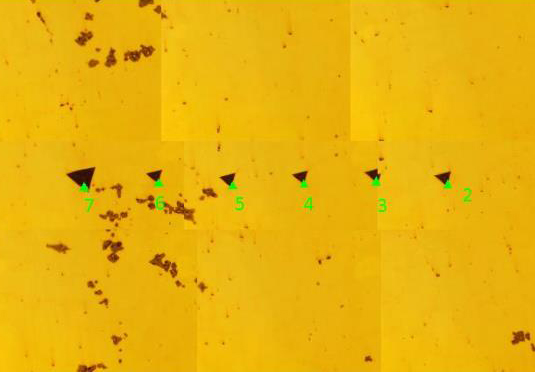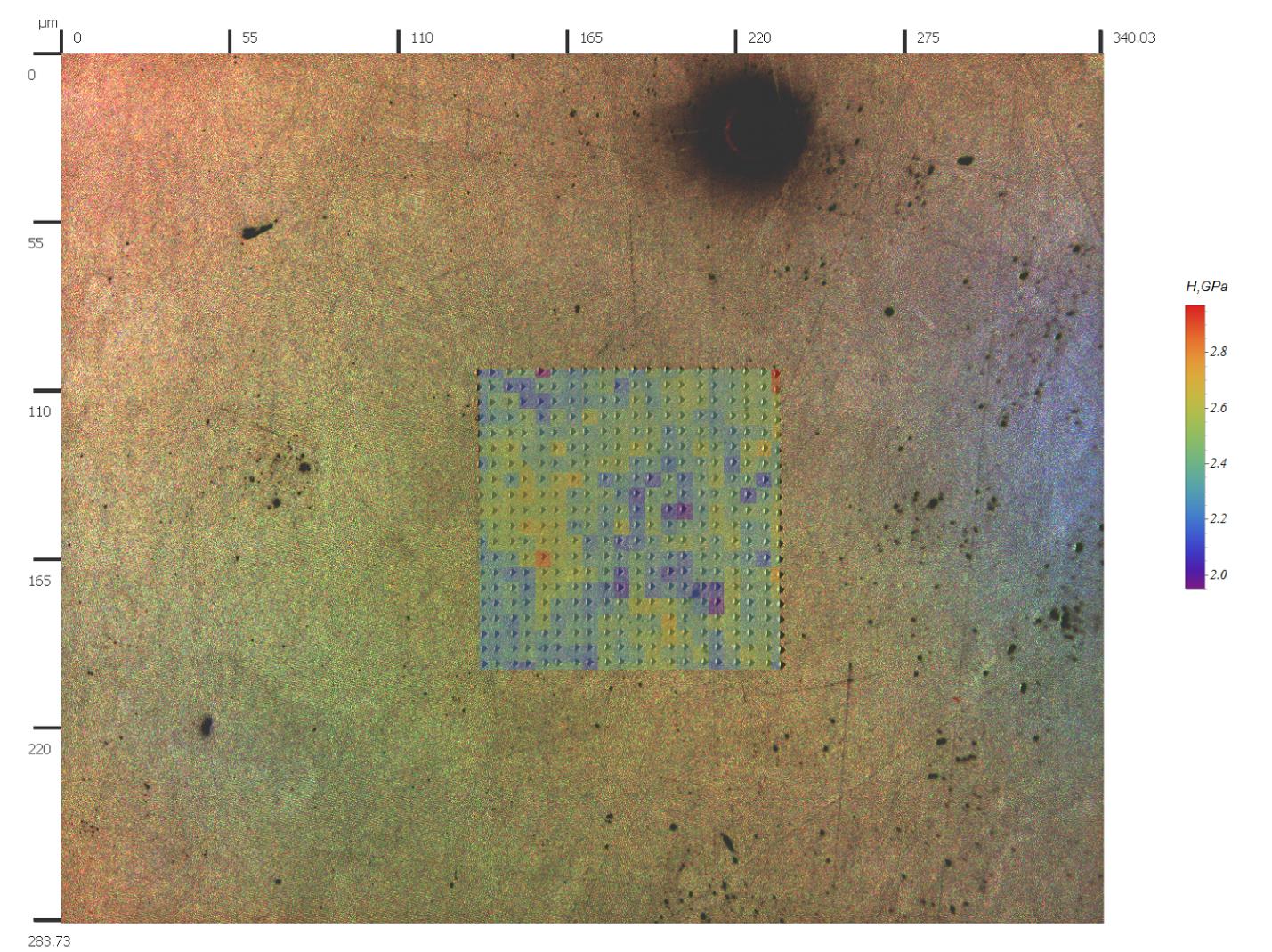 Испытания методом наноиндентирования производились с нагрузкой 4мН, заданный шаг между уколами – 5 мкм (полный номинальный размер поля, покрытого уколами: 100×100 мкм). Томограмма твердости, наложенная на оптическое изображение поверхности образца сплава ВТ6 показана на рисунке 3.